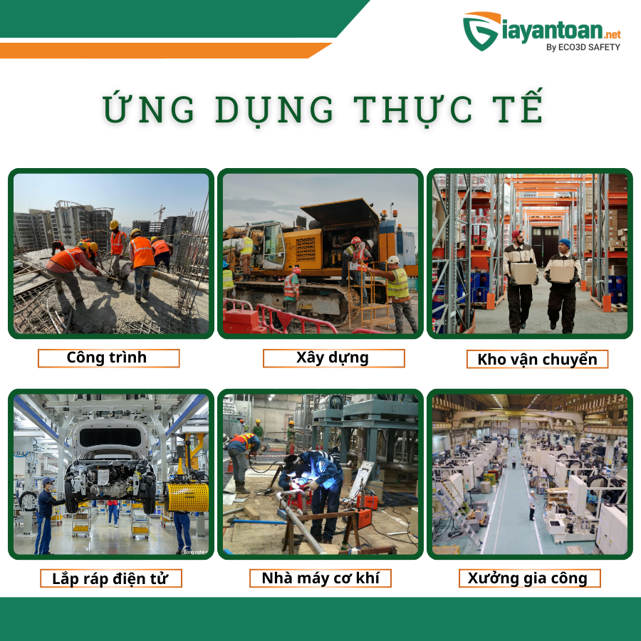 Nhà máy – xưởng sản xuất: Phù hợp cho môi trường có nhiều máy móc và thiết bị vận hành liên tục, giúp người lao động di chuyển vững vàng và hạn chế rủi ro khi làm việc trên nền có độ rung hoặc lẫn vật cản nhỏ.