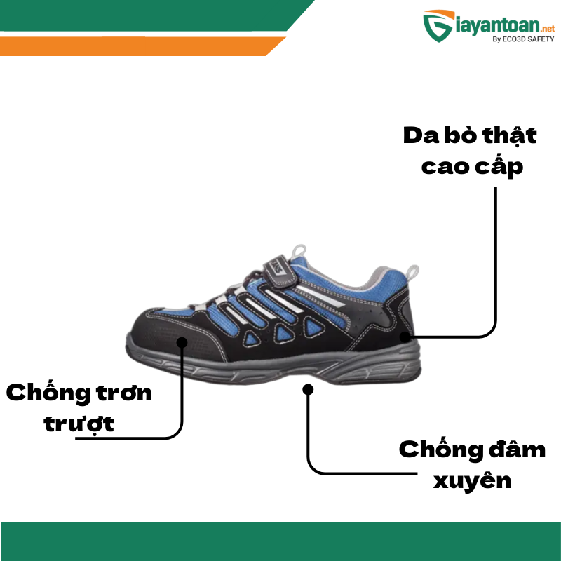Trang bị mũi thép chống va đập kết hợp cùng lót thép chống đâm xuyên, giúp bảo vệ hiệu quả ngón chân và lòng bàn chân khỏi đinh, mảnh kính, vật sắc nhọn hoặc vật nặng rơi trong quá trình làm việc.